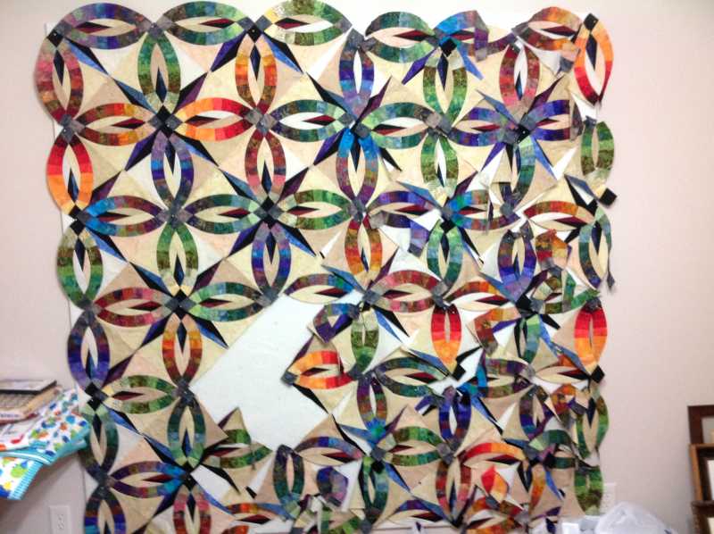 I have trimmed it. It does not have a backing fabric. I want to put the backing face down onto the top with a two-piece hanging sleeve sandwiched in between. Stitch around all four sides. Trim and press as though it is a reversible skirt. Slit the back. Pull it right side out. Put a piece of very stiff stuff inside. Close the slit and put a label over the hole.