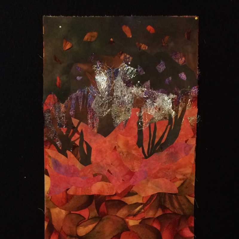 I thought about using more sheer fabric to move these into the midground and then go for NEW foreground trees that would need to look like they are 'ablaze' but I am just stumped at the moment. I don't want to keep adding to the point of it being able to stand up on the floor!!! LOL. Ok, so now that I've vented to friends that can laugh with me,, maybe, I will 'set it on fire' and take a picture, hmmm??