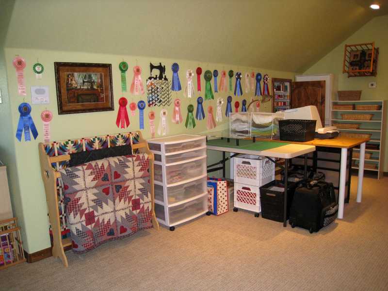 While some were enjoying the weekend seeing the quilts and shopping in Houston or spending time with family, I was spending my time organizing my attic sewing room in my country home. It was to the point that I could no longer enjoy working in it, plus I moved another carload of stuff there so now almost everything sewing related is at the same place. I no longer have to look for thread charts as they have been found and most of my storage is on open shelves or in clear bins. All of my ribbons from the last 12 years have finally found a home. This attic space was originally going to be a large storage room for supplies that didn't get used often, but my DH added length and width to the carport underneath and I ended up with enough space for a large room. It will never be as picture perfect as the original room that was going to be at the other side of the house and is now a guest bedroom instead, but I like the fact that everything is together and easy to see without having to do a lot of searching. The down side to having everything easy to see is all of the projects that are started and not finished distract me to the point that I don't know which one to work on next, after my grandson's quilt that is which I hope to do next weekend.