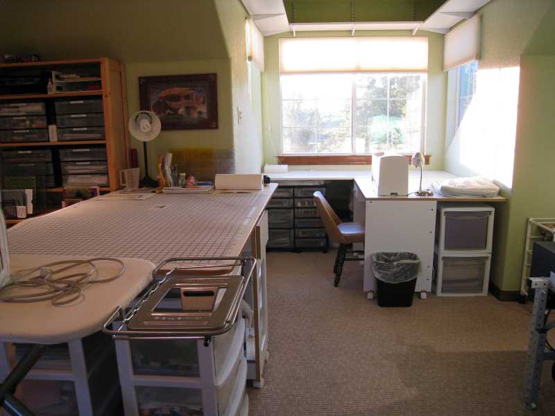 This is my main work area. The cutting table is actually useable. I'm still debating on the best cutting mat to purchase as this one is quite worn and not completely flat. I'm in the process of making a big board for my ironing board. My goal now is to finish 1 project at a time so I won't end up with a cluttered mess again. We'll see how long that lasts!