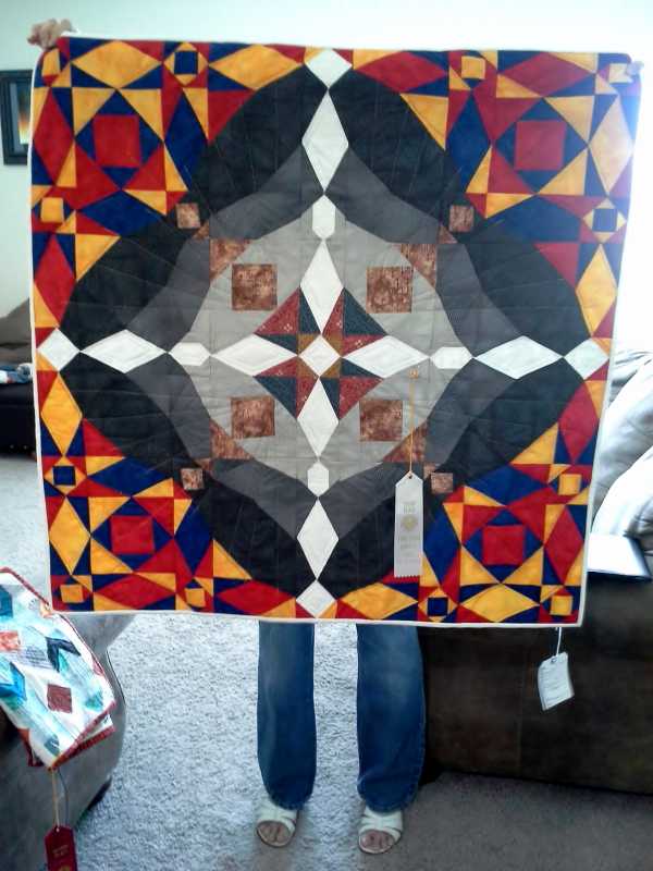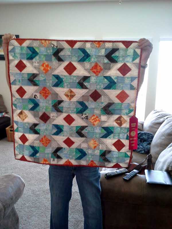 I won't change my quilting style, don't worry, I was just poking fun at the realization that the judging at the County Fair is very clearly, obviously, a very subjective thing, less about workmanship (in this case) and more about the judge's sense of style/taste in quilts. I absolutely LOVE the quilt that got the 3rd place ribbon, and designed it completely; the one that got a 2nd place was a scrap challenge from EQ7, so they did the layout and then participants could color it any way they wanted (so the coloring is mine, the layout is not). I do like it, and I did do heavier quilting on it than the other one, but I by no means like it better than the one which scored lower.