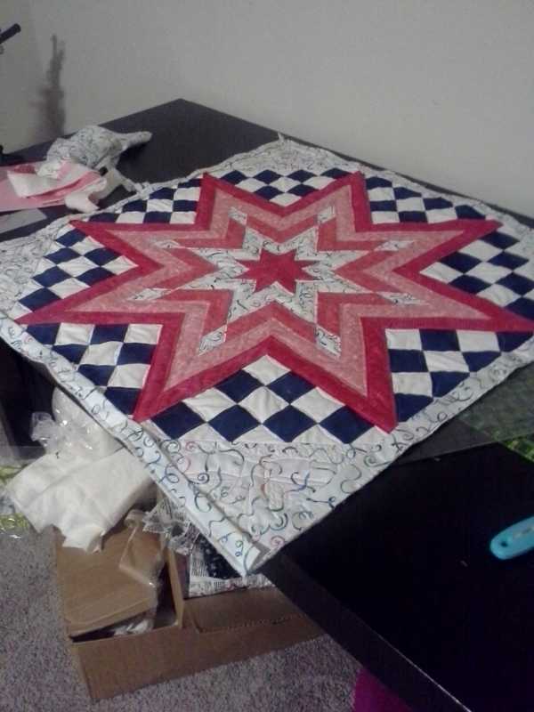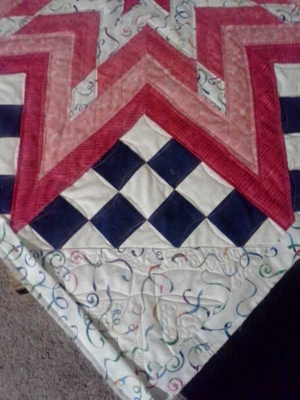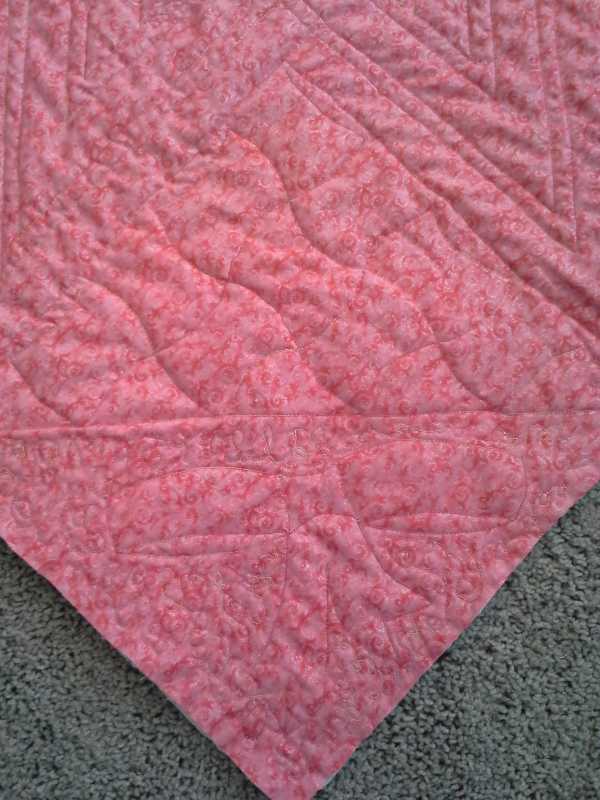 I did finish the quilting on my lone star; it's only about 38" x 38" square, since it's a baby quilt, so not that big. I don't know how much it shows in the photo, but I outlined the various "ribbons" in the star (following the star shape in each row), about 1/4" from both seams in each row. The one "interrrupted" row (the darker pink in the middle, where the points are the white fabric) I did a decorative stitch instead to accent it, alternating one stitch through the center and then a stitch along the inside of each edge (it's a scallopy looking stitch).
