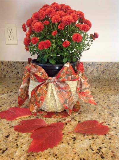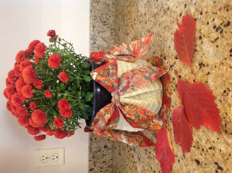 I am also in charge of decorations for the show, so have been working on center pieces for the food/eating tables. Most of our profits go back to the community, so we try to keep costs down. I got a donation of Mums from Home Dopot, bought some $1 place mats from Dollor Store, and picked leaves this morning. I made baskets (our theme) from the placemats. Here is my complete centerpiece for $1!