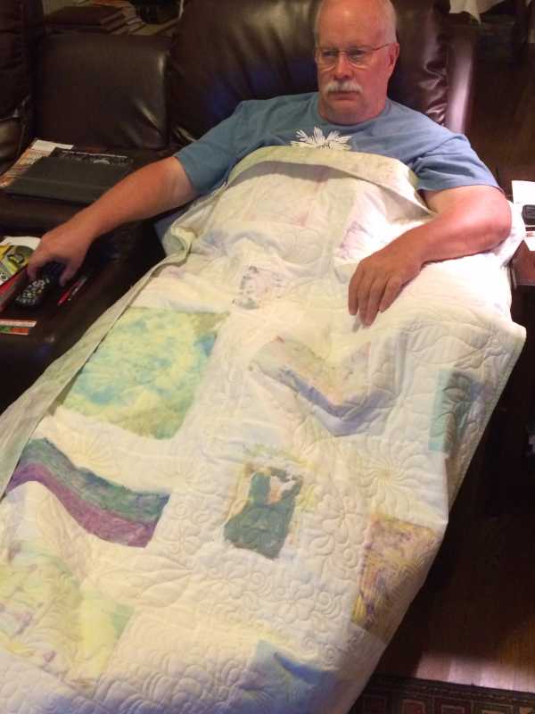 And tonight I finished all of the 'crazy I am!' Custom quilting on my deconstructed screen prints quilt. This was pieced very improvisationally. That made the quilting take a lot of time. Even though my machine has the computer, I still put in over 14 hours on the longarm, resizing blocks so they would fit the spaces. Remind me that improv pieces should be quilted with an overall, edge to edge design, for sanity sake! So here it is, tada!