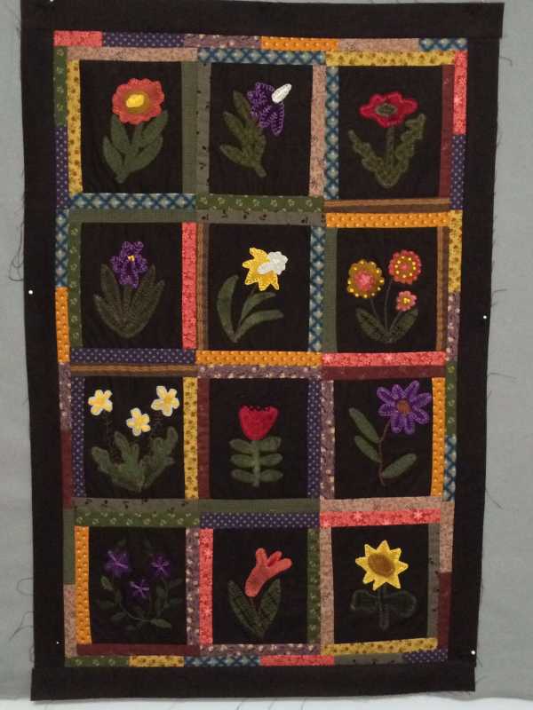 This first piece is wool appliqué pieces on black muslin, measuring in at 4x5 inches finished. The sashings are 1/2inch wide,finished. The black border was cut 2 1/2 inches and there is supposed to be one more border of 1 inch finished half square triangles! Yikes, I'm not good at these tiny pieces, but so far, I've only redone one seam.