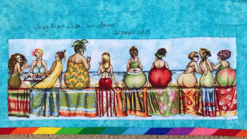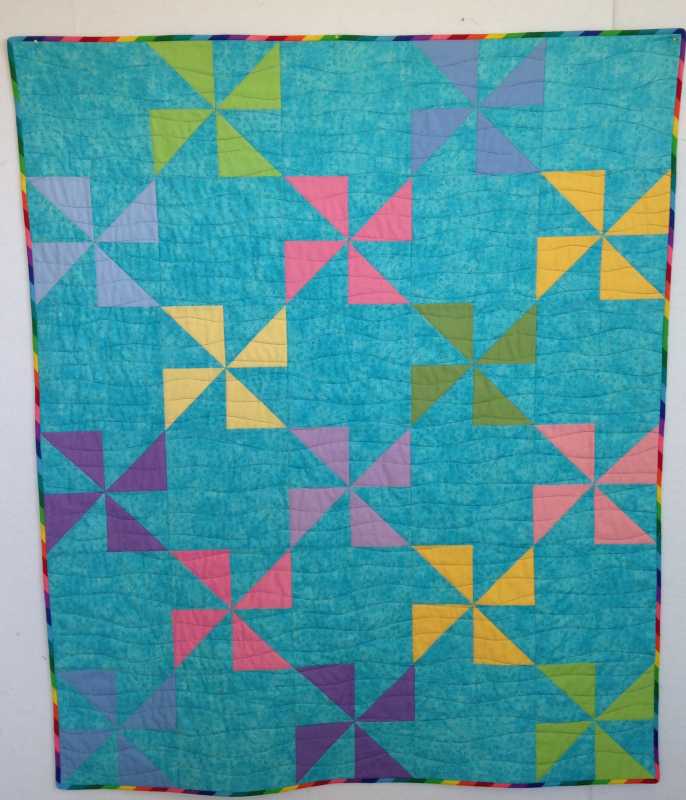 Terrie, you and I were wearing the same thinking cap last week. Last Thursday I learned that a friend of mine has throat cancer and would be starting 7 weeks of chemo and radiation this week. So, what else to do? Make her a quilt. I needed a fast quilt. I used some 5" solid squares I had, bought 2 3/4 yards of teal (her favorite color) and sewed pinwheels. I quilted this with wavy lines and added a multi-striped border cut on the diagonal. This quilt represents all those that love her and are rooting for her. I added a fun panel to the back to bring a smile to her face. It is 40" x 48". I shipped it off yesterday.