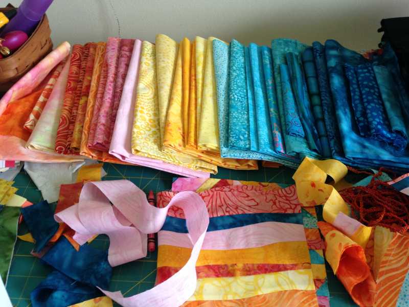 The quilt guild is having a crayon challenge. We pick 3 crayons from a paper bag and use those colors plus one color of our choice. The quilt must be 24" x 36". I found that the size limitation was really harder than I thought it would be. I had several different iterations of a quilt before I could say "ok" let's sew this together. Here are my crayons.