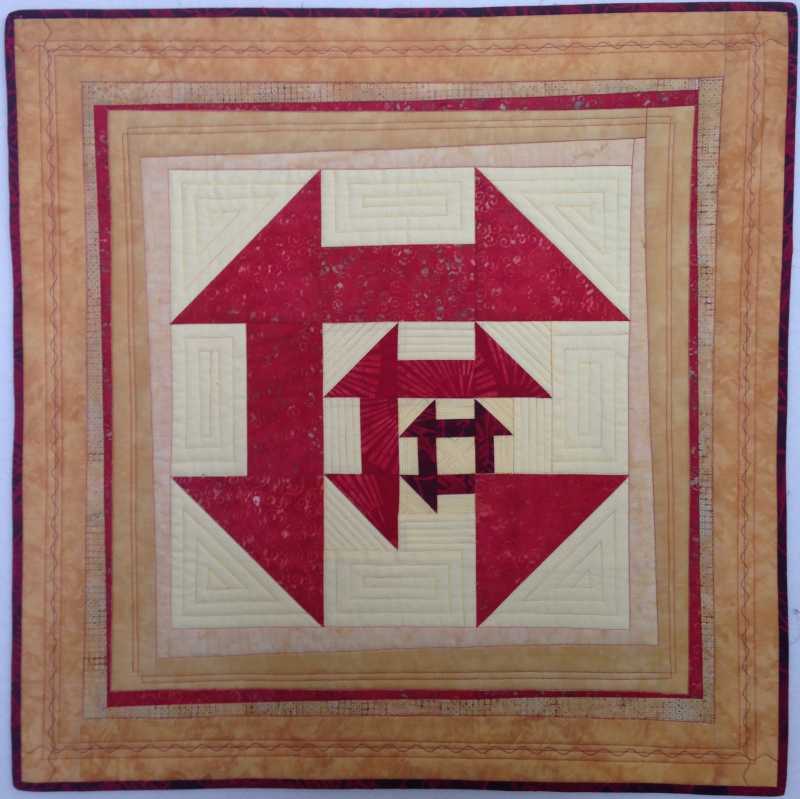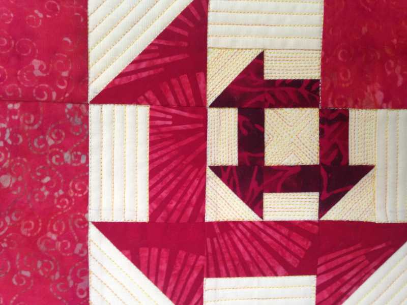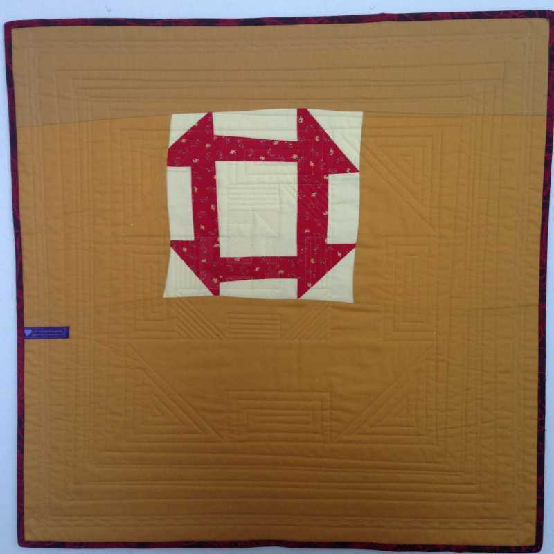 In one of my small quilt groups we decided to buy maize yellow Kona cotton solid and each make a churn dash using red. No size restrictions or red restrictions. The churn dash could be wonky or whatever. We got back about 20 churn dashes of all sizes and even one in pink and green because 1 person didn't hear the word red! So my smaller group "Gang of 5" decided to take the blocks and put them into 3-4 different quilts. The block that I made was the largest of all blocks (15") and they asked me to make mine into a quilt all it's own. And would I please put this other churn dash on the back. It was quite wonky with strange seam allowances and it didn't lay very flat. I said sure. I worked on my block by putting angled borders on it and then didn't like it. I took the borders off, reangled them, added the tiny red and yellow patterned batik and then I said "ok". I've been quilting it, using my walking foot. I've always struggled with the measurements on my walking foot and finally took a moment to check it out and my walking foot doesn't sit straight and therefore the measurements on each side are different. Ah Sybil.... In any case I figured out where to eye ball the stitching to make it the same on either side. Within the large churn dash I quilted 1/2", the middle 1/4" and the center churn dash 1/8" lines. I used a variegated King Tut yellow with just a fleck of red. I like how the middle fabric looks darker, when it is really the same maize in the rest of the quilt. I had some fun with various red threads in the border. I had so little of the red fabrics I used that the binding was chosen by the fact that it was the only one I had enough of. It is 25" x 25".