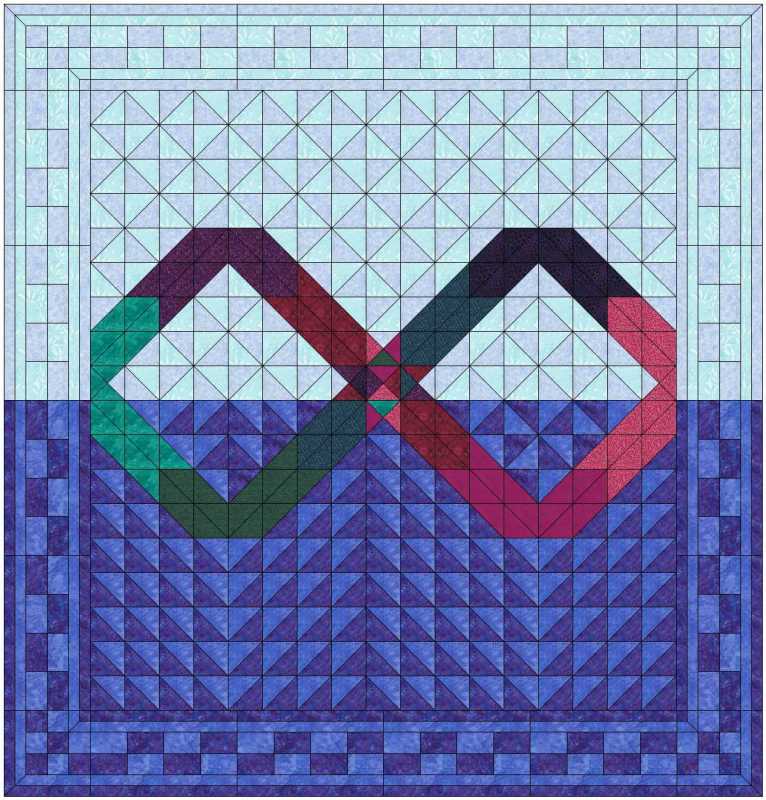 Started in the middle with the center star (though I am hoping it "pops" a little more in real life, and will play with that till I get something pleasing) and worked from there. Realized I need both brights on the far side and working inward, and then as I colored, counting the triangles as I went (as I have a set number cut already...), it ended up making this arrow design which enhances the movement of the infinity symbol. Nice! I like that. The star gives the criss cross/scrappy/mixed feeling, and the arrows merge into each other.