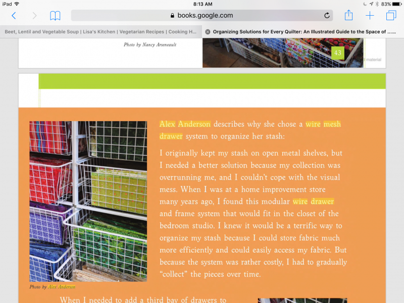 I am in the process of relocating cross country, and am working to design a quilting space that will be more functional. I came across Alex Anderson's wire mesh drawer storage solution but can't find any thing just like it on line. I was wondering if anyone knows or can recommend a solution. It seems like it will really work for me, but I don't want to buy a flimsy solution (been there done that) or overdo with an industrial solution! Any insight or recommendations are appreciated!