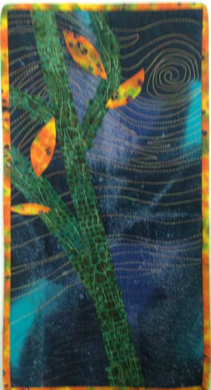 I belong to a small quilt group, we call ourselves the Gang of 5. We decided this year to try new techniques. Each of us would come up with something and we would have 2 months to make it. They are small pieces. Reminds me of our mug rugs. The first go around was my idea. It was fusing torn batiks to make a branch/tree. I made mine to be reminiscent of Van Gogh's starry night. I'm not as pleased with it, but next time I would know how to do it better. Always learning!