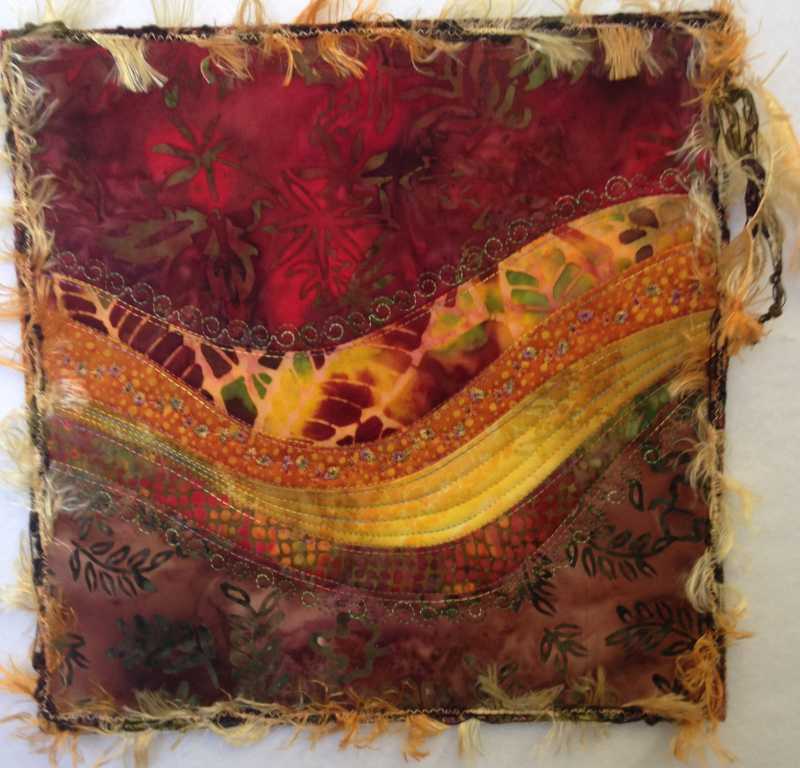 Then our next technique was making waves by turning under the curves, pressing them, and sewing it down to the next layer. It was fun. I added some embellishment for fun. And of course "whizzed around the outside edge" ala Wendy's instructions.