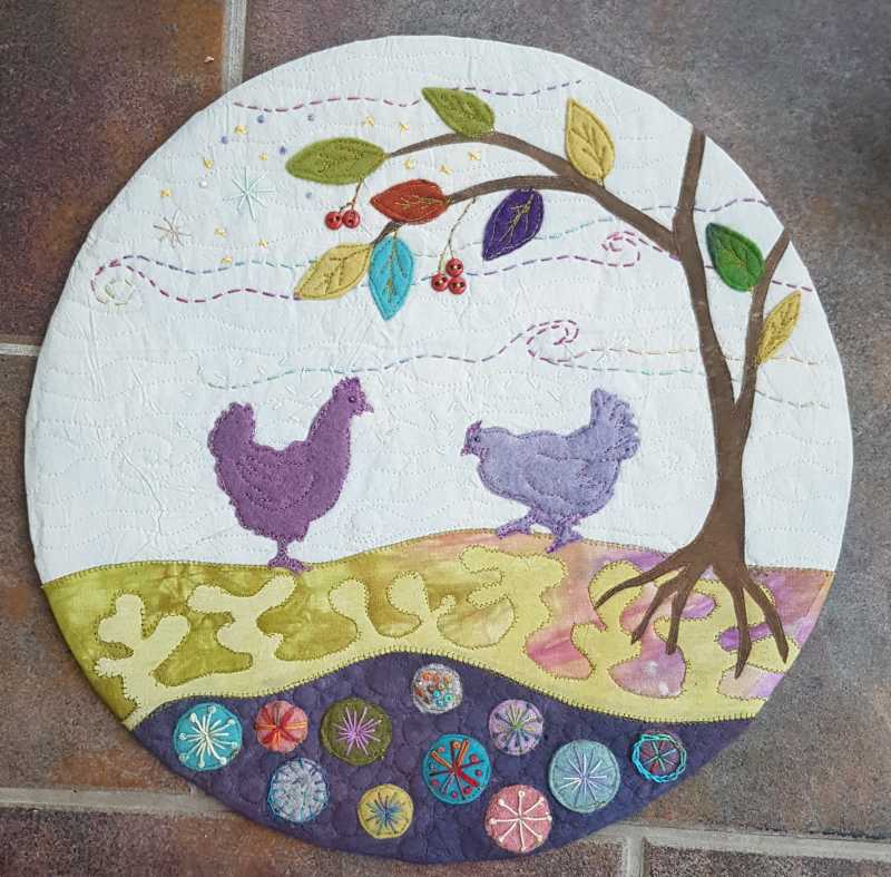 I used inspiration from Gloria Laughman for the bottom bit, traced chickens from the chicken feed bag and took inspiration from Pinterest for the tree and leaves. It hangs really straight.