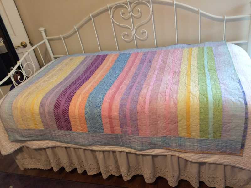 I went to a 4 day quilting retreat at the beginning of March. I had the opportunity presented to me at the last minute and because I was completely unprepared, and I haven’t been to one in several years, I decided to just take my serger, and jelly rolls (precuts and my own strips). I put together 9 lovely tops that have been evened up, and some have had borders added. I’ve decided that after quilting most of them they will be handed off to the binding people. These will be given to the children that attend Royal Family Kids Camp in August. Two are already off to the binders. And a third one was finished by me for a ‘grandma in waiting’. I’ve been doing a lot of longarming for the camp quilts and a few for Doors To Freedom. DTF is a house for young girls being rescued from the sex-trafficking in our country. Each young lady gets a quilt to call her own, and take with her when she moves on to the next step in her healing process.