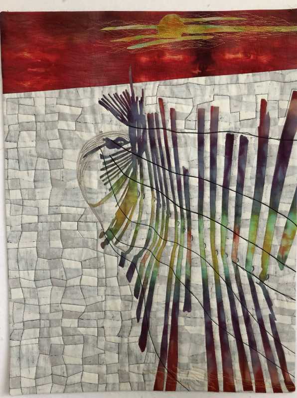 I had a lovely red piece of ice dyed fabric I used for the sunset. I carefully "built" the fence and added it to the top sunset portion. I quilted along some of the pattern of the background to represent the snow drifts. Here is "Technicolor Snow Fence at Sunset".
