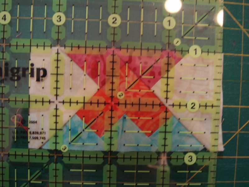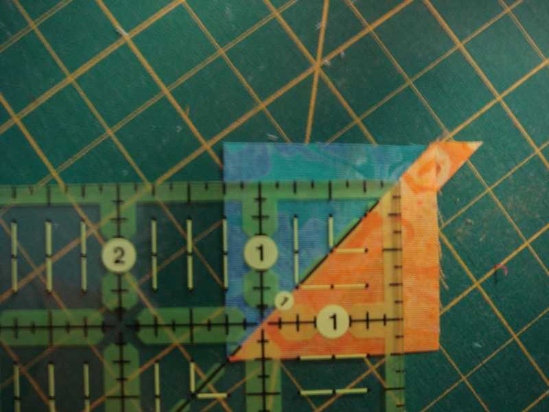 The finished size must be 3" x 7". So the top of the basket is a hypotenuse of a half-square-triangle, which should measure 3". The side of the basket should be 2-1/8" - not convenient to divide by 3 (for the 3 squares). If you round up, you will have a hypotenuse of more than 3" - the points of the basket will get caught in the seam allowance. If you round "down" - then you will have a little bit of background fabric showing between the side seam and the basket - which is what I prefer...about 1/8 of an inch on each side.