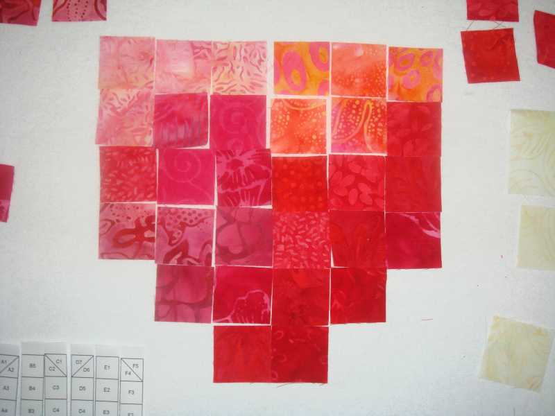 Each individual square in the heart should be 1/2” x 1/2” finished. Add to that 1/4” seam allowance, each square should be cut at 1” x 1”, but I prefer to give myself some room, so I cut them 1-1/4” x 1-1/4”. I placed them as I wanted them to appear (but I forgot to invert, so in the end the “pink” part will be on the right hand side instead of the left like I imagined).