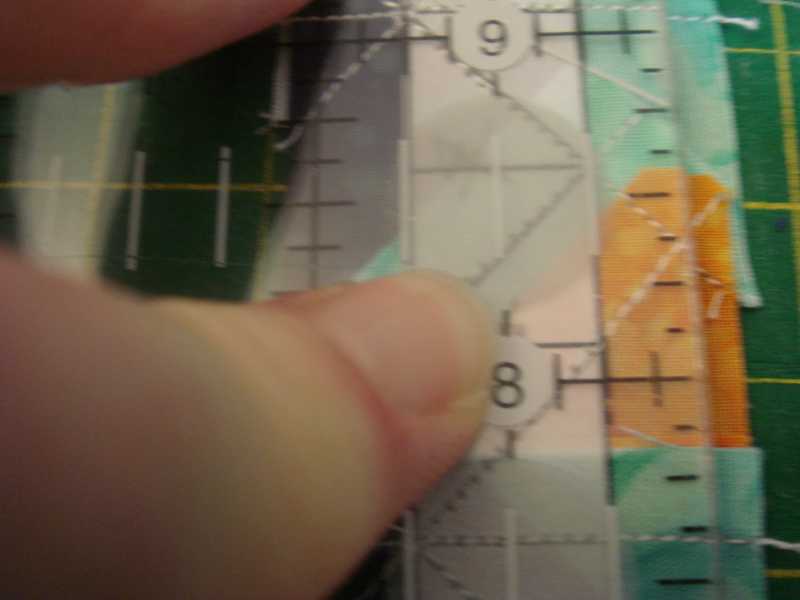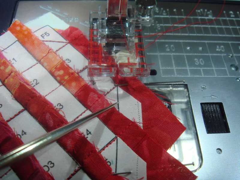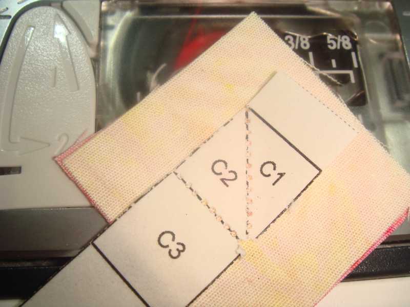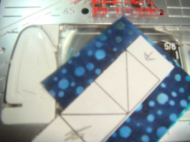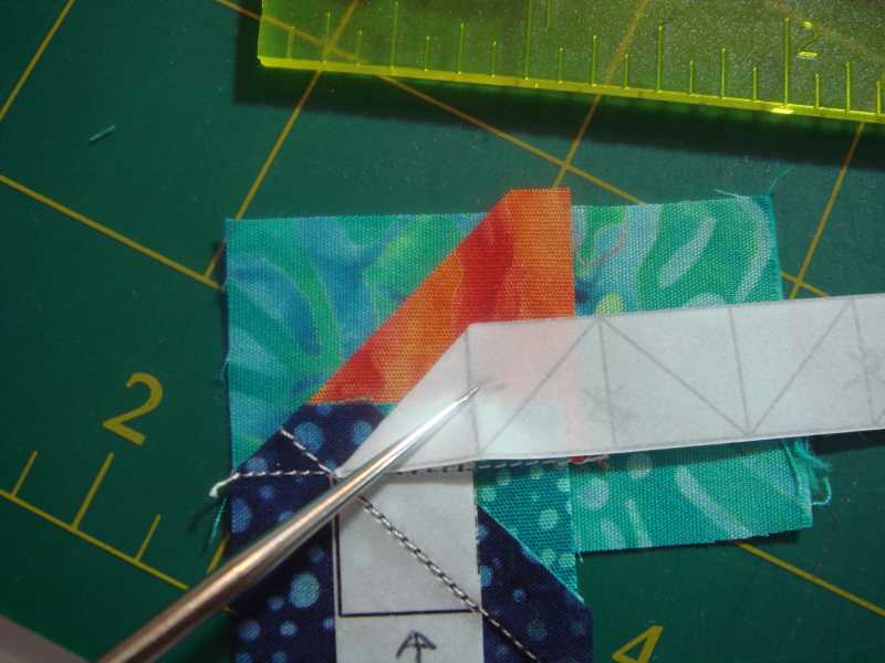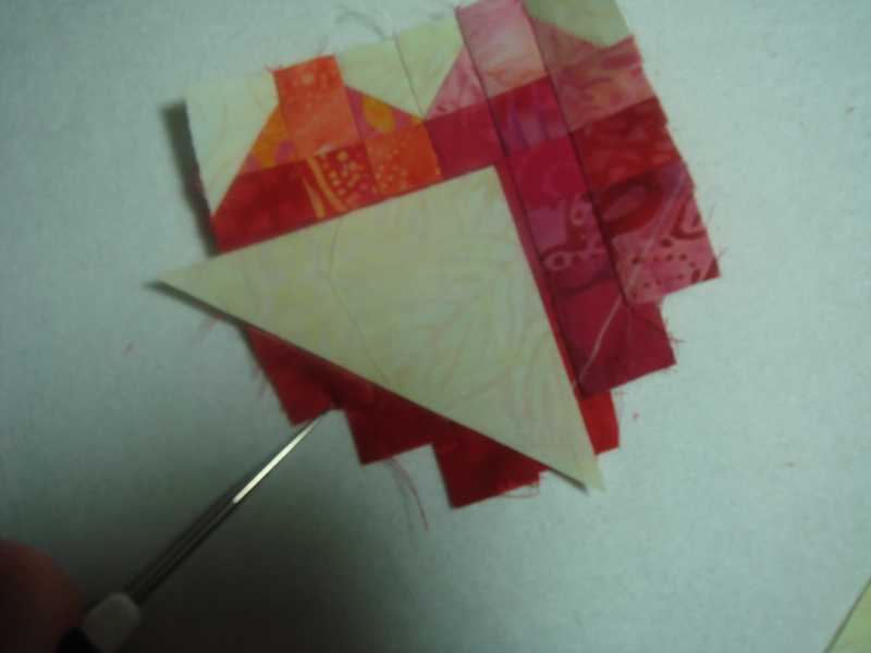 I prefer not to have the seam allowance on the foundation. Knowing the fabric is a little bigger than required, when I start the piecing of the HST, I will center the resulting square and sew on the diagonal. Then I will remove the excess fabric. OK, on this one, the foundation is “used” – I had taken the “wrong” fabric initially, so I had to undo.