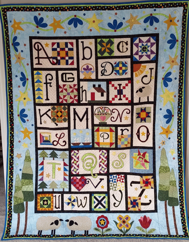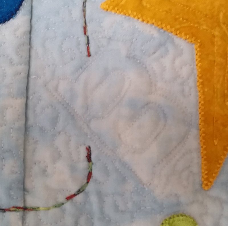 I included the lower-case letters in the quilting for the blue borders; that was really fun. I used Superior Fantastico variegated thread for circles and spirals in border and sashing. The blocks use Superior Mono-poly; the border stippling uses a matching Isacord; the applique and top-stitching of applique use the Superior Magnifico thread kit.