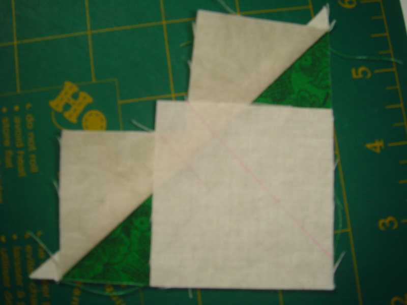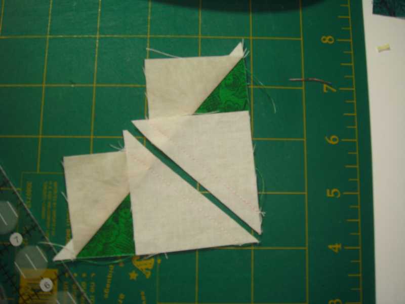 Make the flying geese using the 3-3/4" square, and two 2-1/4" squares, tracing a line 1/4" away from the diagonal line.