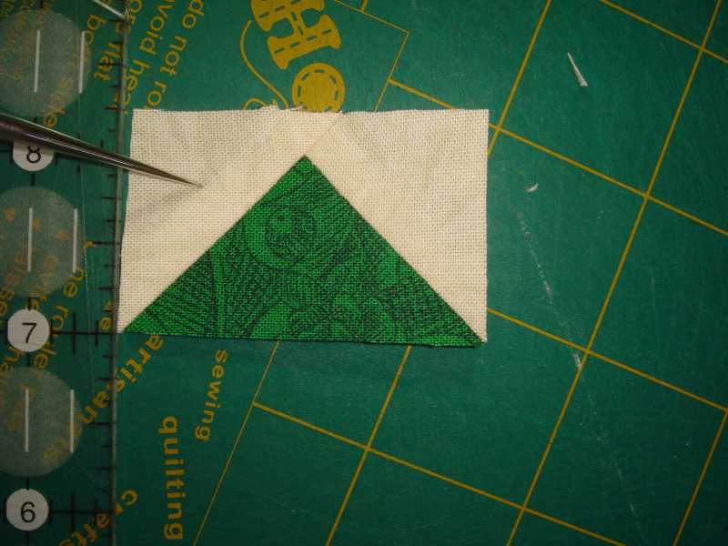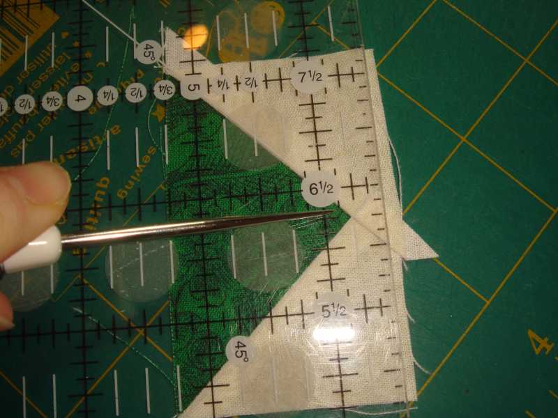 Then, align the 45 degree line on the seam, and 1/4 inch mark on the "point". Cut the excess.