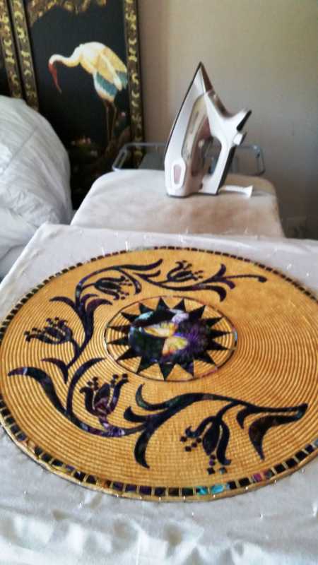. I blocked it just by steam ironing on the back and itt lays fairly square now. The colour runs are less noticeable now I've quilted it to death and touched up some areas with a white paint except in certain light when those areas glow!! I'll put up pics later this morning, it's a bit dark still for photos. I put it in our groups show in Wirksworth and I got some really nice feedback, even a handshake from one visitor.
