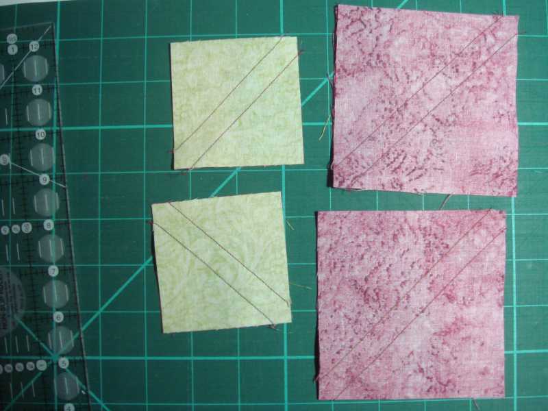 Then I cut each on the diagonal. I will use 4 “halves”, 4 halves will remain and can be used somewhere else (in the second block, maybe).