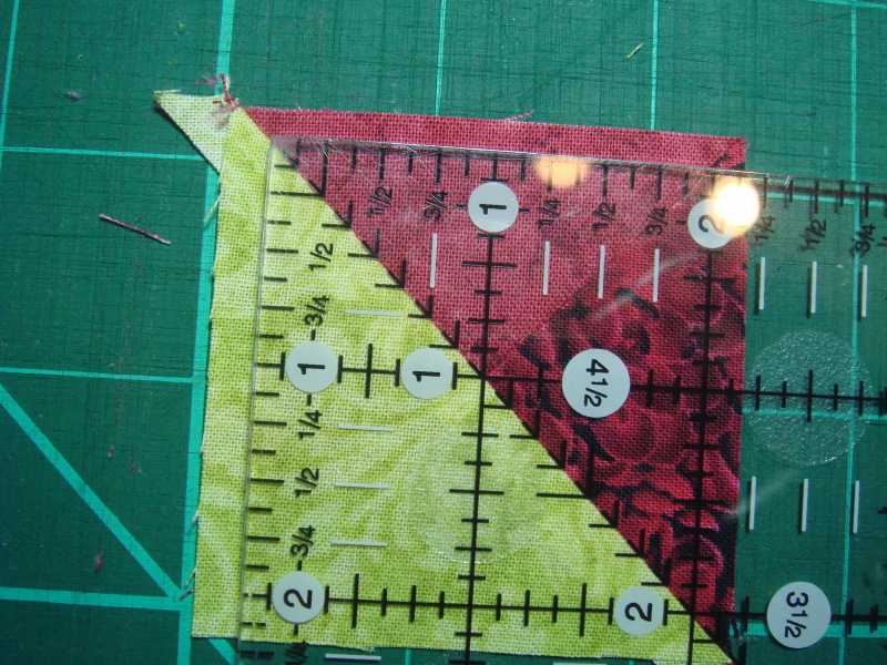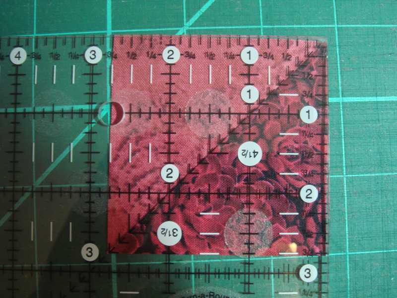 Trim the 4 patches to 2” x 2”, making sure the center is aligned on the 1” mark.