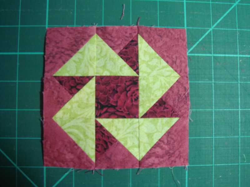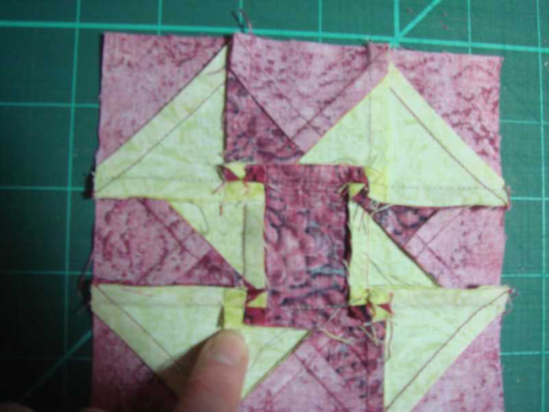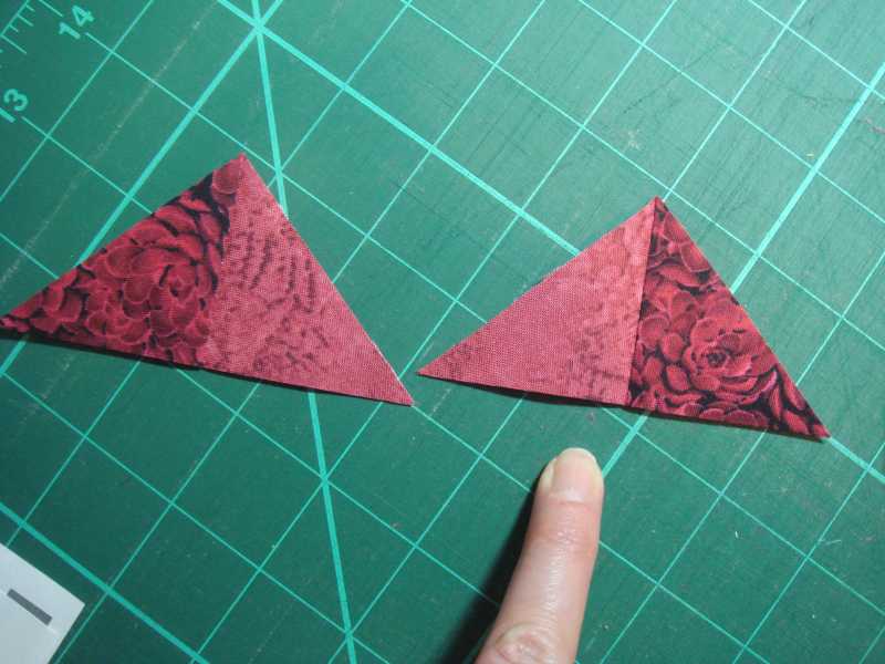 The seam allowance of this HST should be pressed towards the color that will be “inside” (the darder red in my photo).