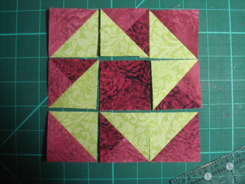 Then, instead of using 1 E patch of each color and cut it twice on the diagonal, I’d rather use 2 E patches of each color and make 4 HST, and trim them to 2-3/4” x 2-3/4”.