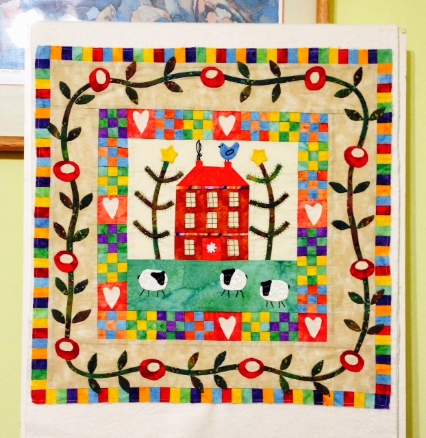 Then, I cut 2 D patches on the diagonal (light green) and sew to each QST (red).