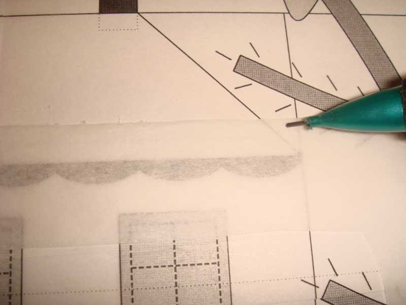 I thought that the roof trim appliqué was too narrow (1/8” at the widest point), so I decided to include this with the roof, and appliquéd the roof to the house.