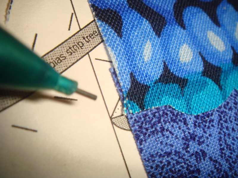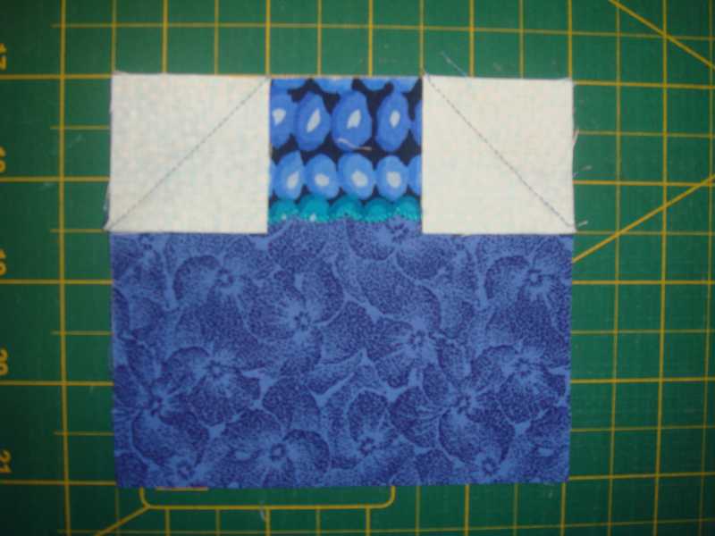 Draw a diagonal line, corner to corner, on the back of the SKY square 1-1/2” x 1-1/2”. Align each of the squares with each size of the roof (as per instruction) and stitch on the marked line.