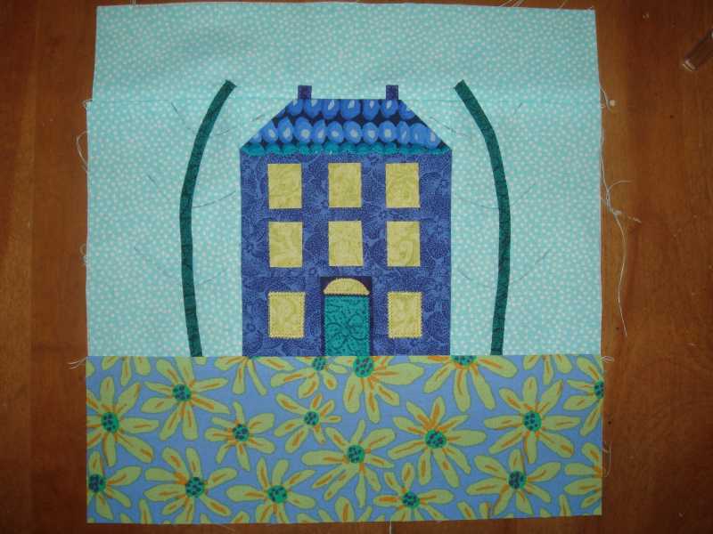 Align the appliqué with the stitching line of the house, and fuse in place.