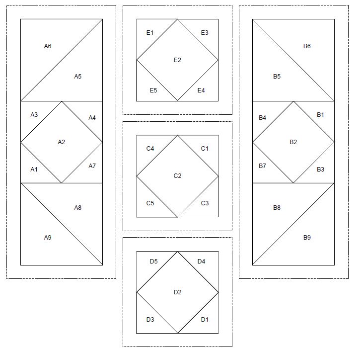 You will need 66 "flying geese" blocks and 4 "four-patch" for the corners. Each measures 2-1/2" x 2-1/2".