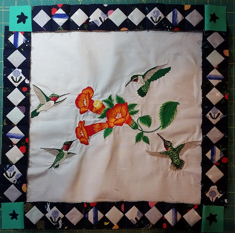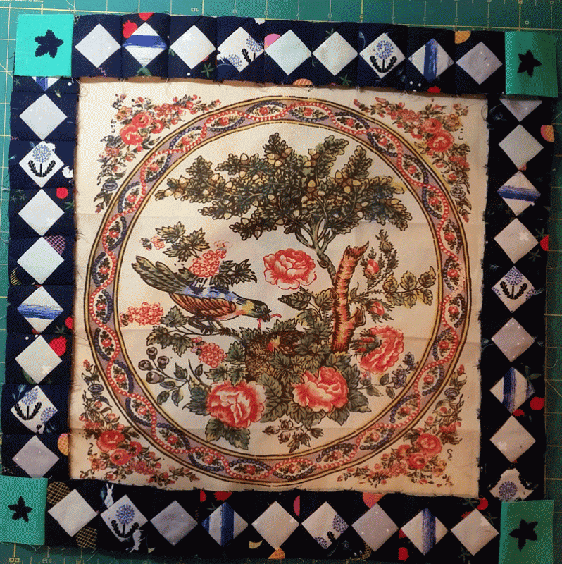 Wellllll, I can't make up my mind on the center block. I have the Month 2 strips done so that I can look at them with the embroidery piece I made as an option to replace the applique medallion, and I also had purchased the chintz panel and can now look at it with Month 2.