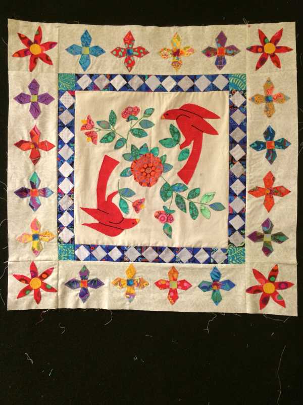 After working through 4+ episodes of BBC Doc Martin (love it!) I'm done with Month 3. I had planned to do needle turned appliqué but finally accepted that that wasn't going to happen any time soon. As I had done Month 1 as fused with hand blanket stitch I decided to again do fused appliqué, but with machine blanket stitch. I also decided to do 4 -17" strips for the crosses with separate 4.5x4.5" squares for the corner pieces for the petaled flowers. It made it easier to do the machine stitching and I like the look.