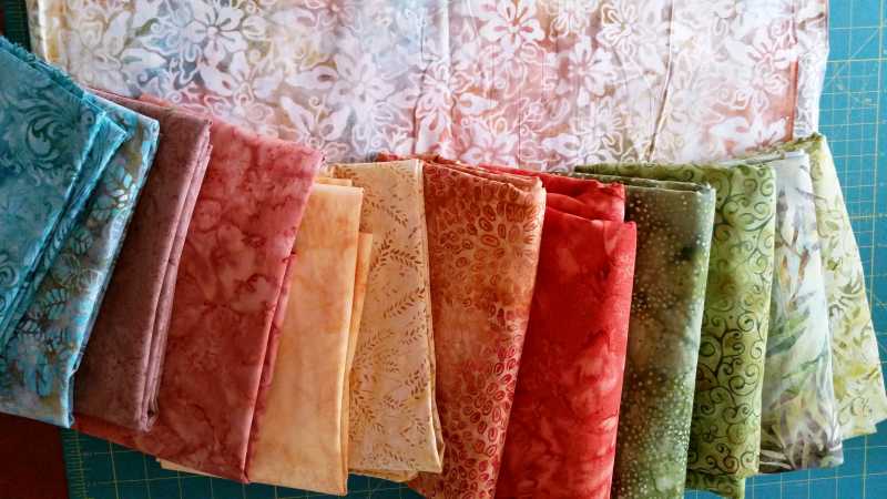 With the first sample, my block finished at 16" rather than 16 1/2". Since I paper-pieced and sewed exactly on the seams, I concluded that my problem was not having a perfect 1/4" seam. Using the paper template to set the 1/4" seam on my machine made the whole process a lot easier. Now I'm ready to move on to making the actual halo medallion block! My samples were all made with scraps. Here's my fabric selection for the BOM: