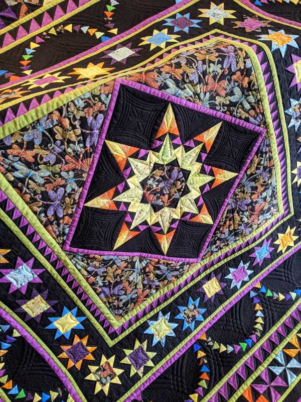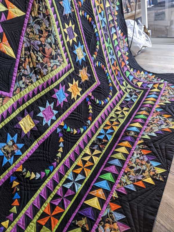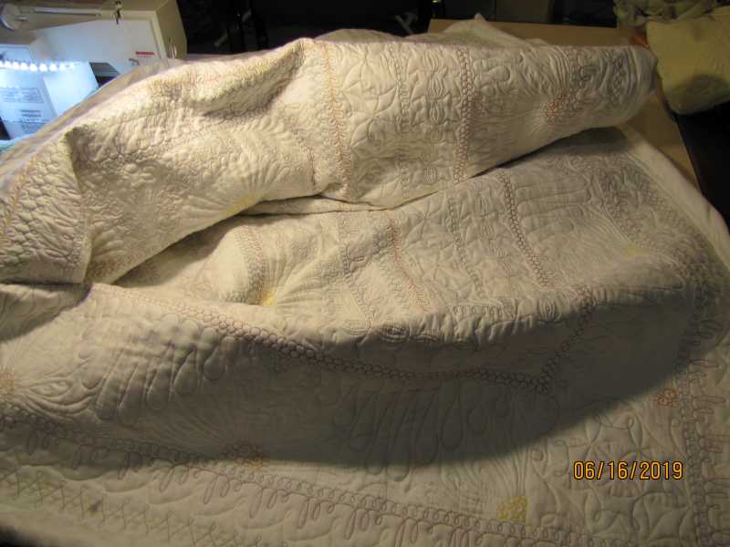 Finally got it quilted, barely in time for Vermont Quilt Festival. Here's a shot of the front, and showing the quilting from the back...I called it Halo for Sue.