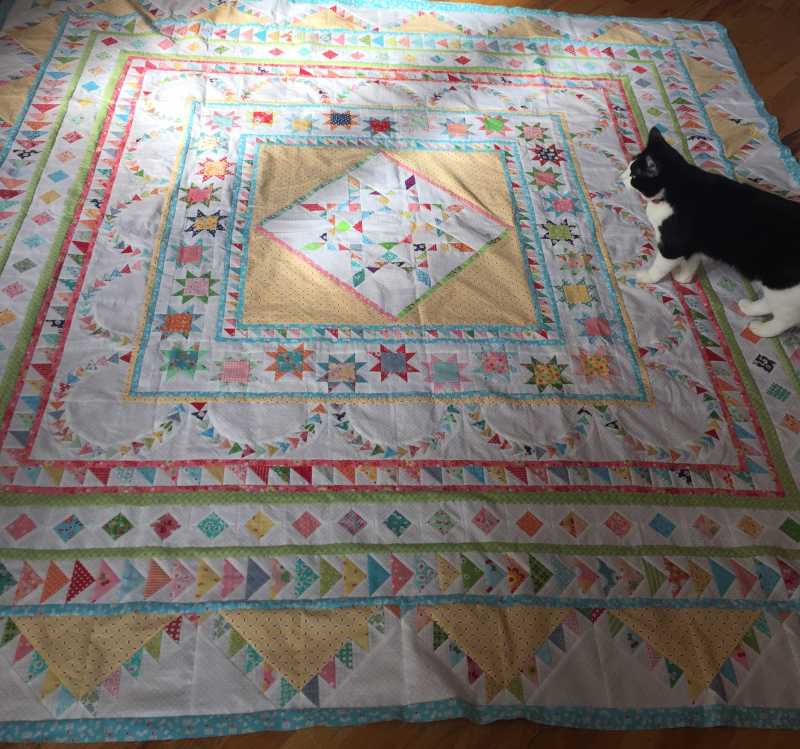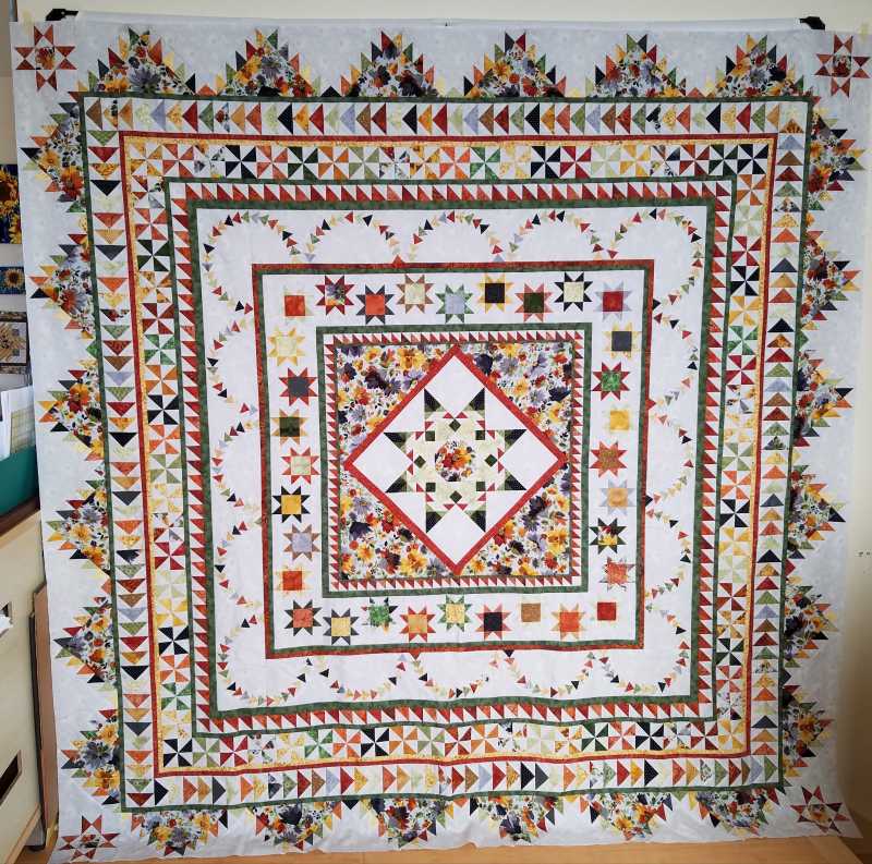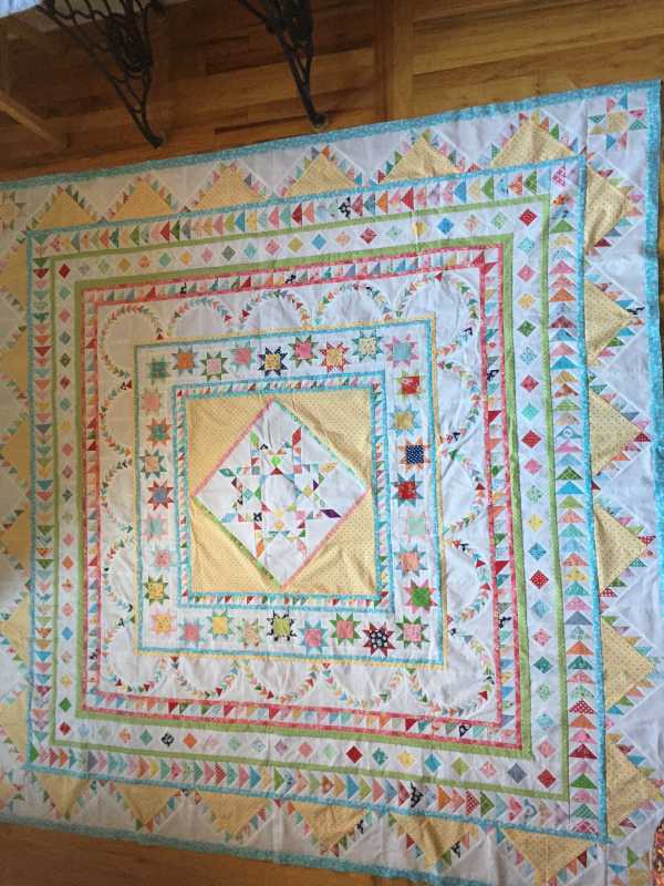 Here is my finished Halo top. Finished it on Dec 1. I really enjoyed this journey and felt Sue’s Pattern was excellent. I may do Stars for. new Day next. Thank you Sue for a beautiful quilt. Wish you were still here to see it. I dedicate my version to you.