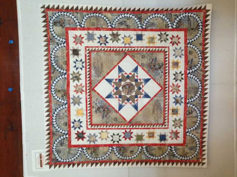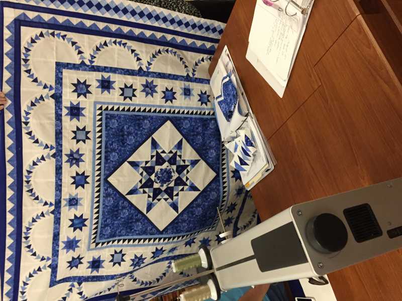 Just a teaser--this amazing blue and white version is being made by one of the Halo Sunday Sew and Sews who meet at my house once a month. Janet substituted Seminole pieced borders for the sawtooth blocks and has an amazing final Seminole border ready to go on the outside, you see it laying on the table on the right.
