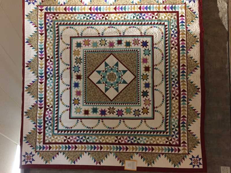 I finished my quilt a while ago now but didn't have a good way to take photos after it was quilted. Our guild's show was this weekend and my Halo Star Medallion was there. Unfortunately, the lighting doesn't show her off well but you can get some idea of how Joan Hett quilted it. I was very pleased with the final result!