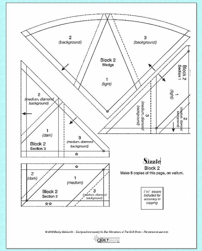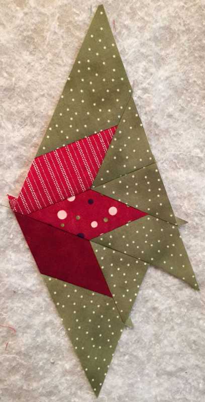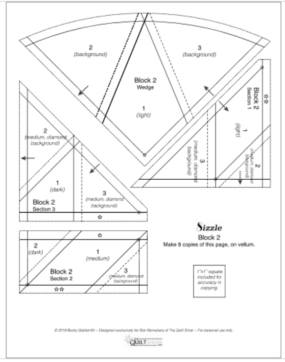 The diamond section for this block was made using a Rapid Fire Lemoyne Star ruler. The size needed is for a 7" block (3-1/2" sections), a 2-1/4" width of fabric per diamond (makes more than eight) and a 3-1/2" width of fabric per background. These went together pretty quickly as I've made many Lemoyne star blocks without paper recently. The challenge was in the block assembly. In a perfect world they should make a perfect block but I had to do a little pulling on the fabric to keep from losing the points when I placed the template from Block 1 on the units to square them up. Using starch and a dry iron would probably help with this. I just don't take time for starch and use steam for almost everything. I added the half-square triangles on the tips after the fact when I decided there was too much green, before I had sewn the diamonds to the wedges. I'm sure there will be a button or something in the center of this block.