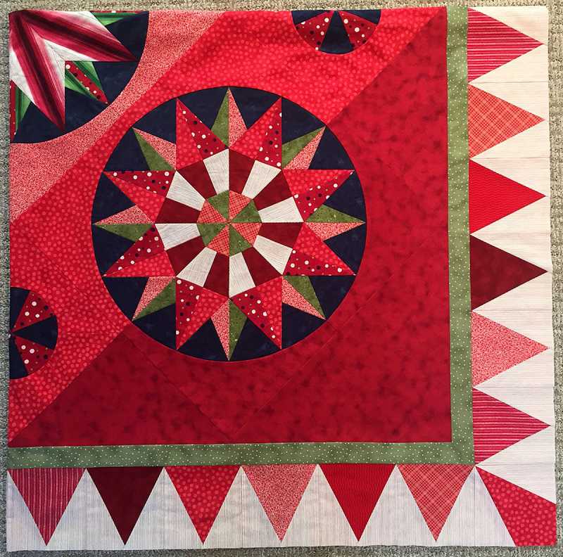 I've finished the first pieced border for my 5 block version, plus a mitered narrow border in between to make it fit. I miter my borders before sewing them to the quilt. You have to cut exact, pin, and sew with an open toe and even feed foot so the fabric doesn't creep. I've been doing this for several years now. I did it first on attic window blocks and it worked so well I started doing it on full borders too. The cutting can be confusing at first. Just add the unfinished width or length of the quilt center to twice the finished width of the border. Be sure to leave 1/4" unsewn at the inside of the miter, pin and sew 2 opposite sides first, then pin and sew the remaining sides, sewing on the border side so you can see where to start and stop.