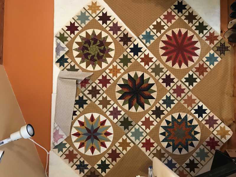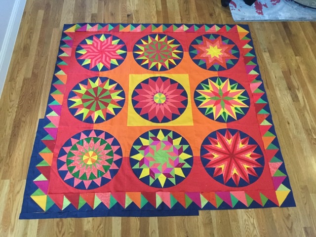 I’ve finished piecing my borders and am trying to decide whether to add the second border like Barbara did. You can see it laid in on one of the corners. I will bind it In the navy blue. If any of you are thinking of doing this, I had plenty of the red/orange and the navy fabrics. The green was a bit close because of how large you need to cut the squares for the sew and trim method for the half square triangles. It is doable if you are careful. And, I must admit I made a few trimming errors and still had enough with do-overs. I plan on quilting this myself on my stationary machine so am thinking of what to use for quilting designs.