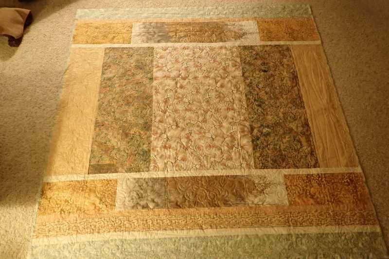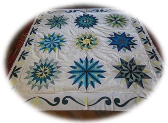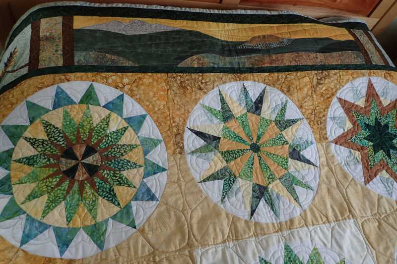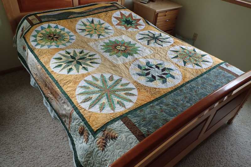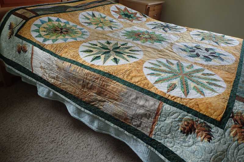 Ta Daa! I just got my quilt back from Kathy Herman (Hearth and Home Quilting) who did a fantastic job with her longarm. This was my first BOM ever. The pine cones in the corners were adapted from a paper piece pattern by Cyrille Zellweger. The mountains on the top panel are Longs Peak and Horsetooth Rock near my home in Northern Colorado. The tree panels on the sides are from a Robert Kaufmann fabric collection called A Walk on the Path. I pieced the back with leftovers and other stash fabrics. I call it Foothills Compass. Thank you TQS!