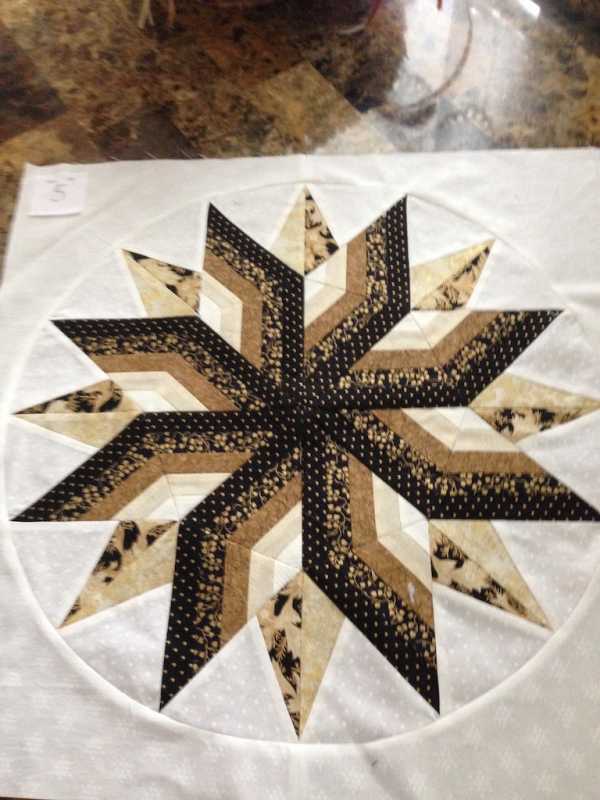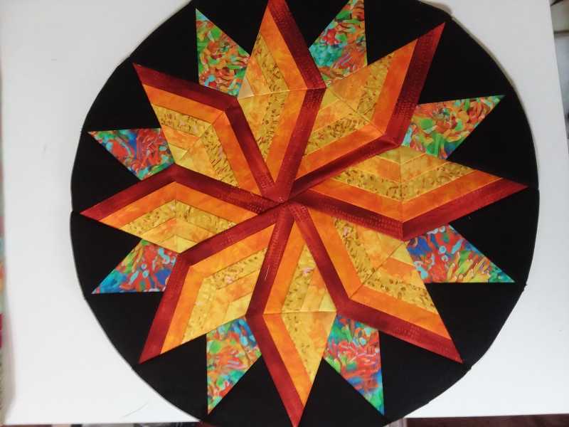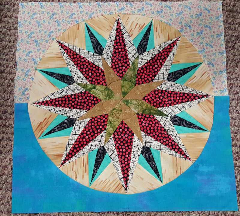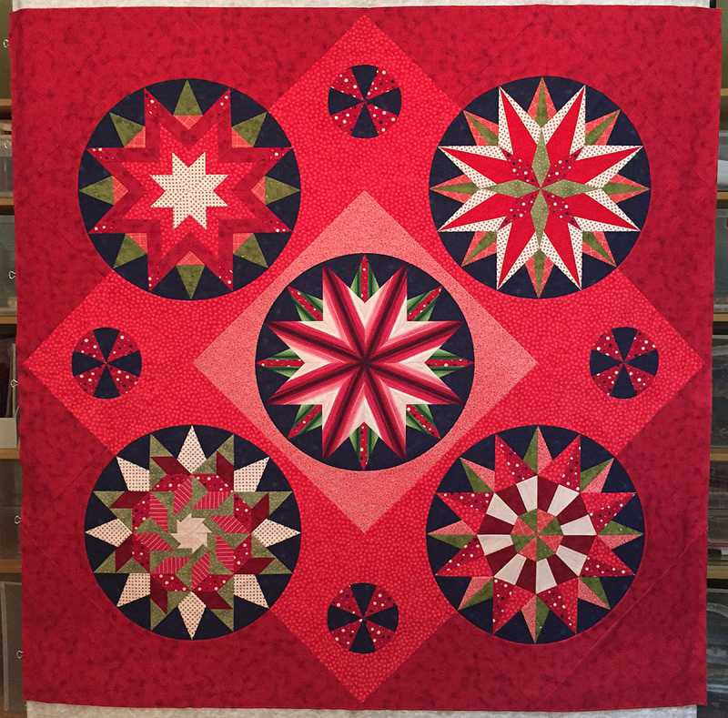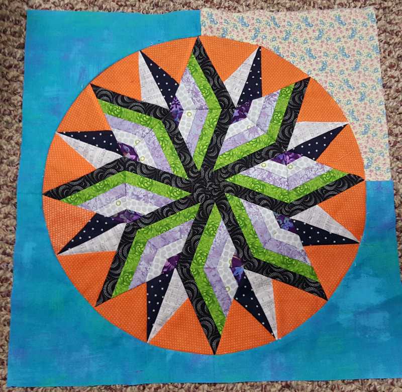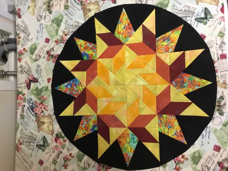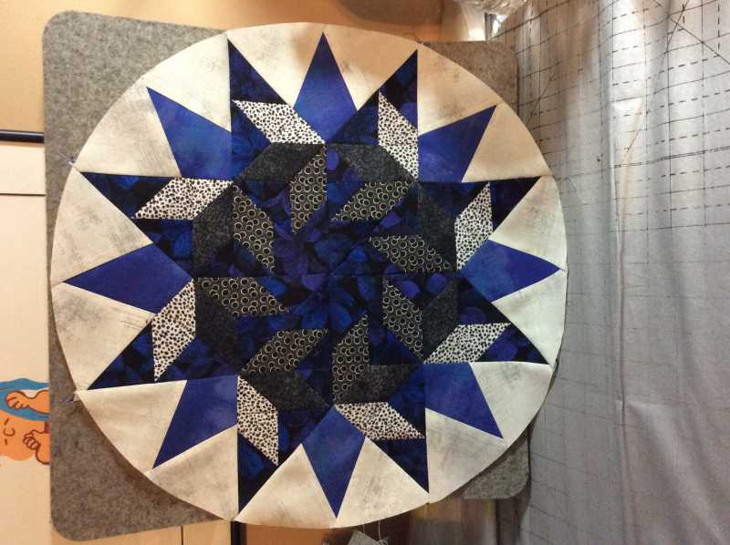 I decided on a setting for my 5 blocks and did it quickly before I could change my mind. The small set in circles were sewn as pinwheel blocks then cut into circles.