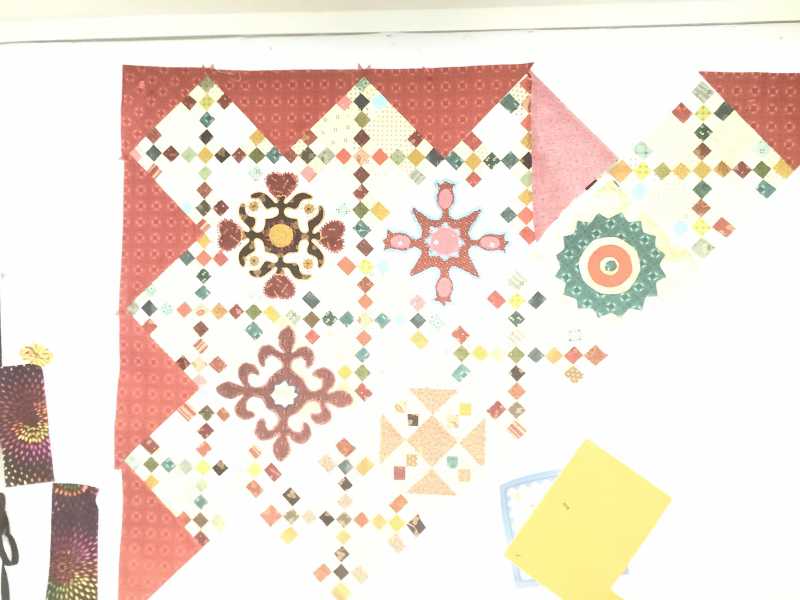 Stitched the 8 patch lines so it would look like pieced. Started to stitch with dark mono filament on the batiks squares. It would probably
