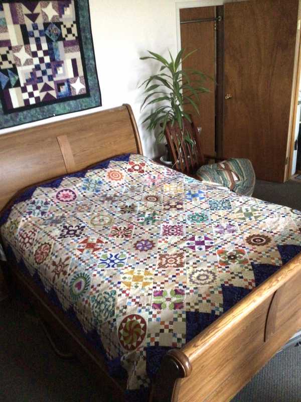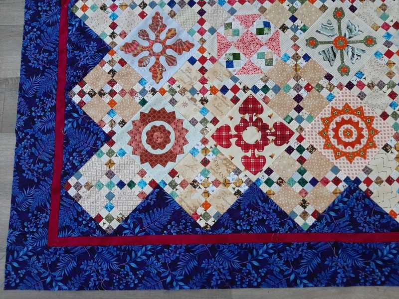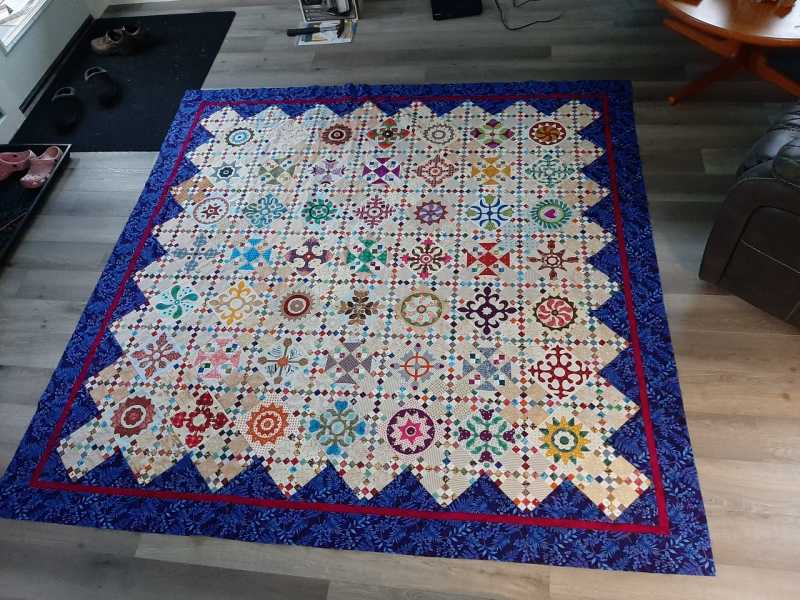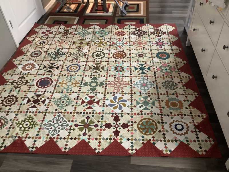 Congratulation to all of you who have persevered and created very beautiful quilt tops. Here is mine. I haven't decided how to quilt it yet. I enjoyed the whole process and never got tired of this quilt. Well, maybe a little with all those nine patches.
