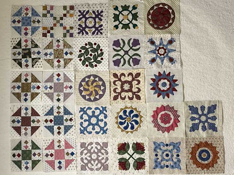 Barbara, I loved your comment Isn't it fun to see the quilt taking shape. So I laid my blocks out to get a look at mine taking shape. My 5 applique blocks on the right side of the photo have not been edged stitched yet. Right now